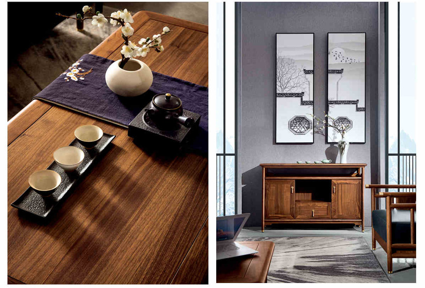 设计灵感来源于明式架几案和铜钱造型,独得明式家具真意,简洁沉稳,辅以纯铜配饰,俊雅中再添华美。